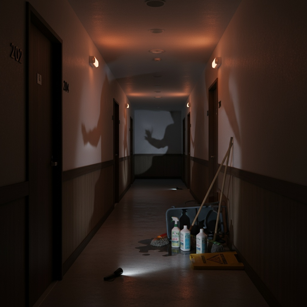 足音の現象から1週間後、今度はより直接的で恐ろしい体験をしました。深夜0時頃、203号室の清掃を終えて建物を出ようとした時、2階の廊下で人影を目撃したのです。