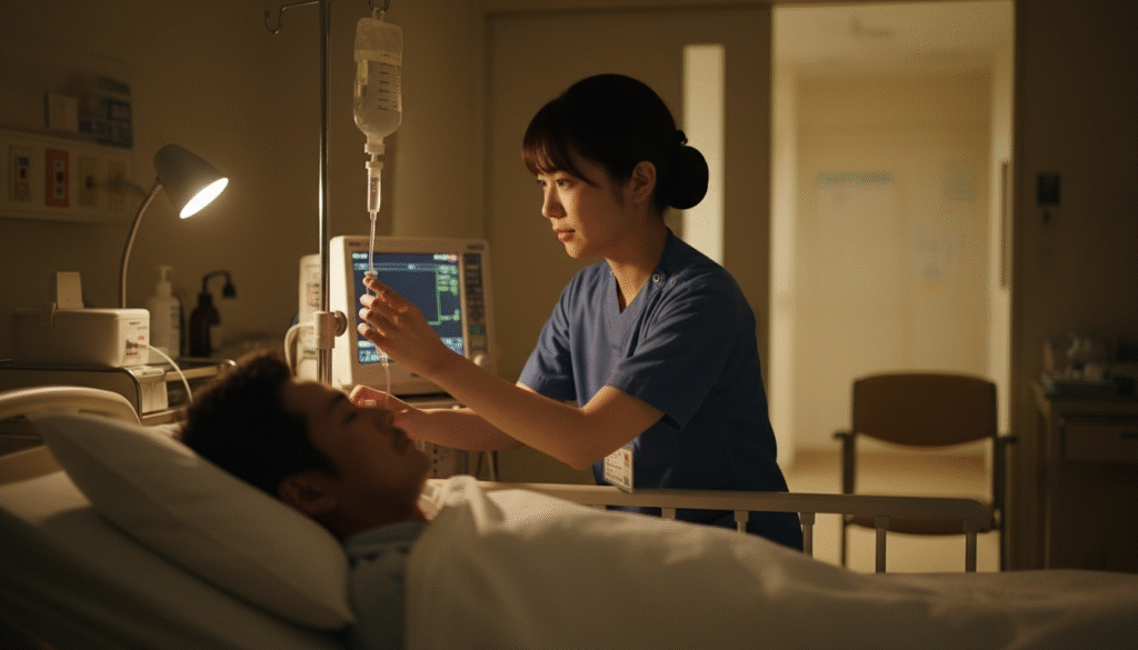 私の担当は主に重症患者の看護で、医師の指示の下で点滴管理、バイタルチェック、そして患者や家族への対応を行っていました。救急医療の現場では、一刻を争う状況が日常茶飯事で、緊張の連続でした。
