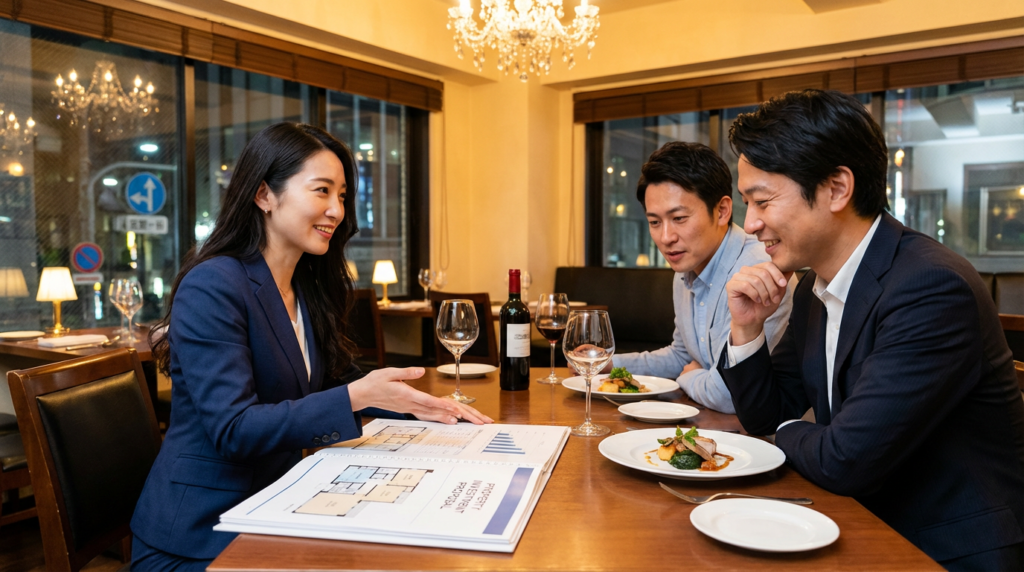 食事が進むにつれ、綾香は投資用マンションの魅力について詳しく説明し始めた。「山田様の年収でしたら、年間100万円近い税金を納めていらっしゃいますよね?投資用マンションを購入すれば、減価償却費や管理費、修繕積立金などを経費として計上できます」