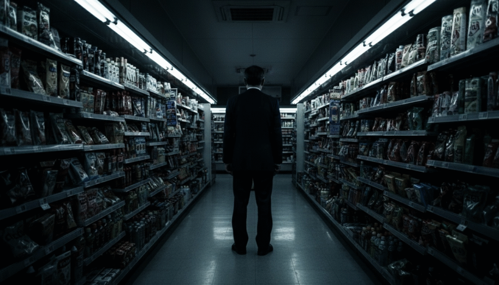 奇妙だったのは、男性の行動でした。商品を手に取ることもなく、同じ通路を何度も往復するのです。足音も妙にぺたぺたと湿っているような音で、まるで濡れた靴底がタイルに張り付くような不快な音が店内に響いていました。
