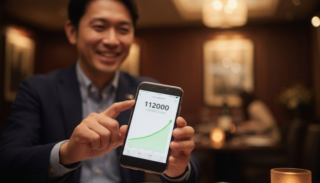 追加投資から2週間。山本さんのアプリには驚異的な数字が表示されていました。60万円が85万円に成長。25万円の利益です。由美さんの投資額も同様に増加していました。