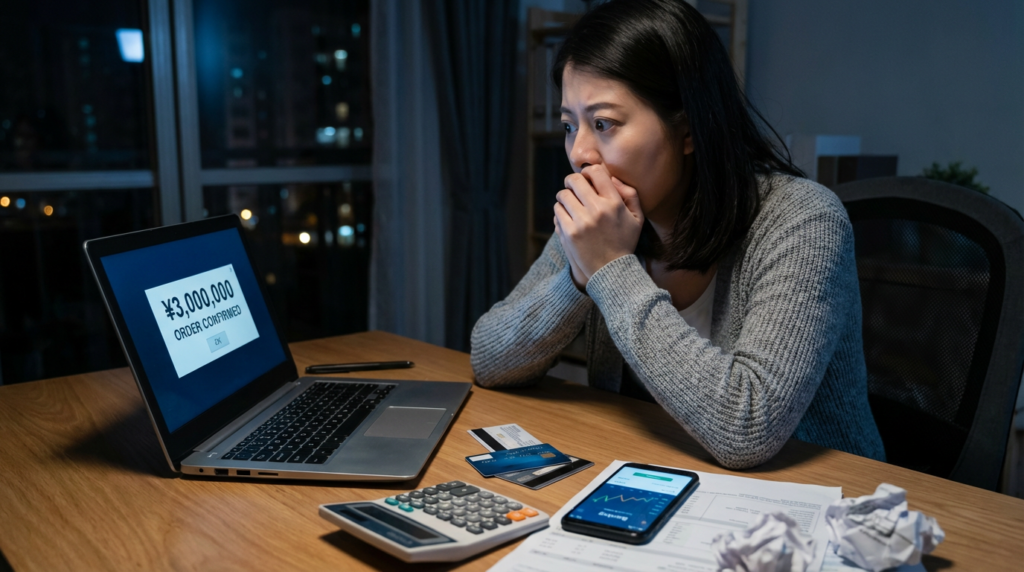 「結婚資金」という言葉に、美咲は決心した。複数のクレジットカードのキャッシング枠を使い、足りない分は消費者金融で借り入れを行い、なんとか300万円を工面した。震える指で「発注」ボタンを押し、指定された口座に300万円を振り込んだ。