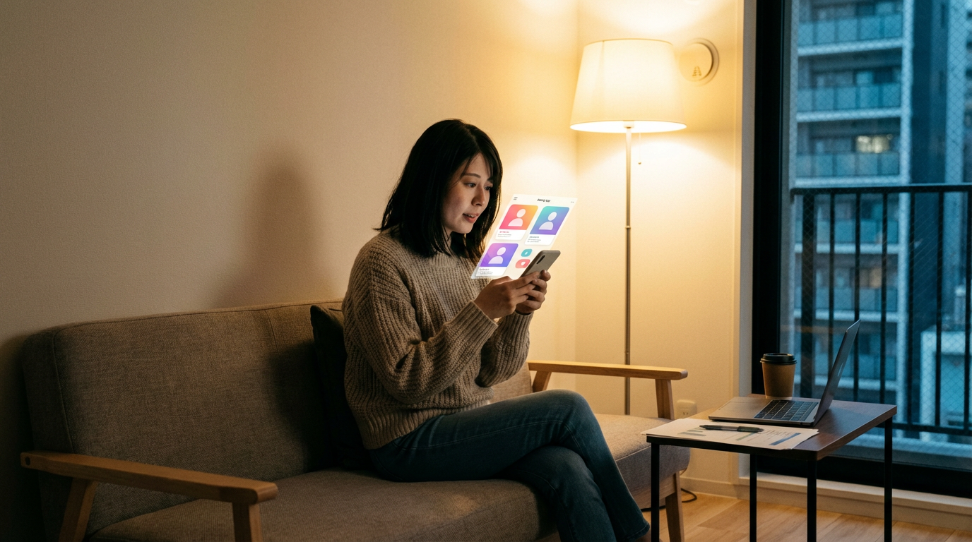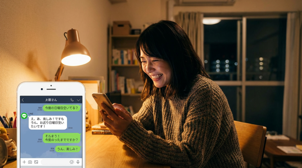 美咲は恐る恐る「いいね!」を返し、メッセージのやり取りが始まった。リョウのメッセージは丁寧で、美咲の話をよく聞いてくれた。「仕事お疲れ様、無理しないでね」「美咲さんの考え方、すごく素敵だと思います」といった優しい言葉に、美咲の心は次第に癒やされていった。