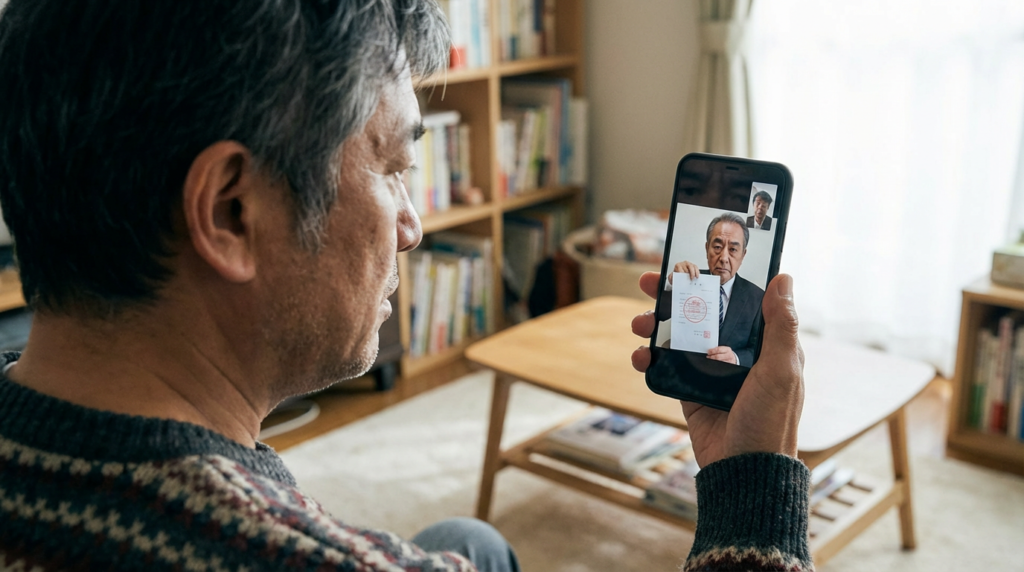 ヤマダの指示に従いLINEを登録すると、すぐにビデオ通話の着信が鳴った。画面に映ったのは、きちんとしたスーツを着た初老の男だった。背景は重厚な木目の本棚で、いかにも官公庁の執務室といった様子だった。