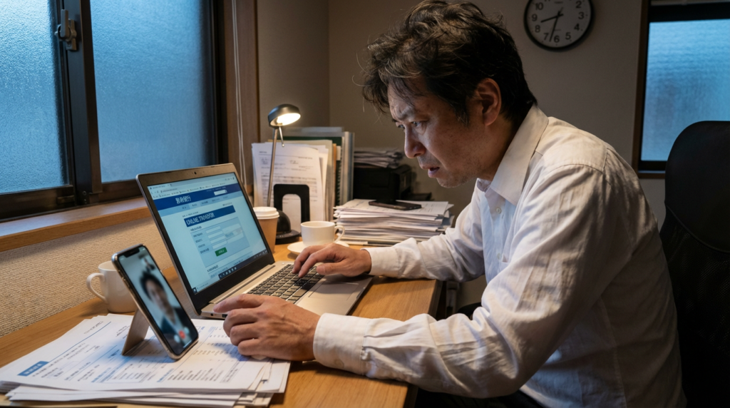 「今すぐ手続きしないと、1時間後には口座が完全凍結されます。ビデオ通話は絶対に切らないでください。私が指示を出しますので、お手元のパソコンでネットバンキングを開いてください」